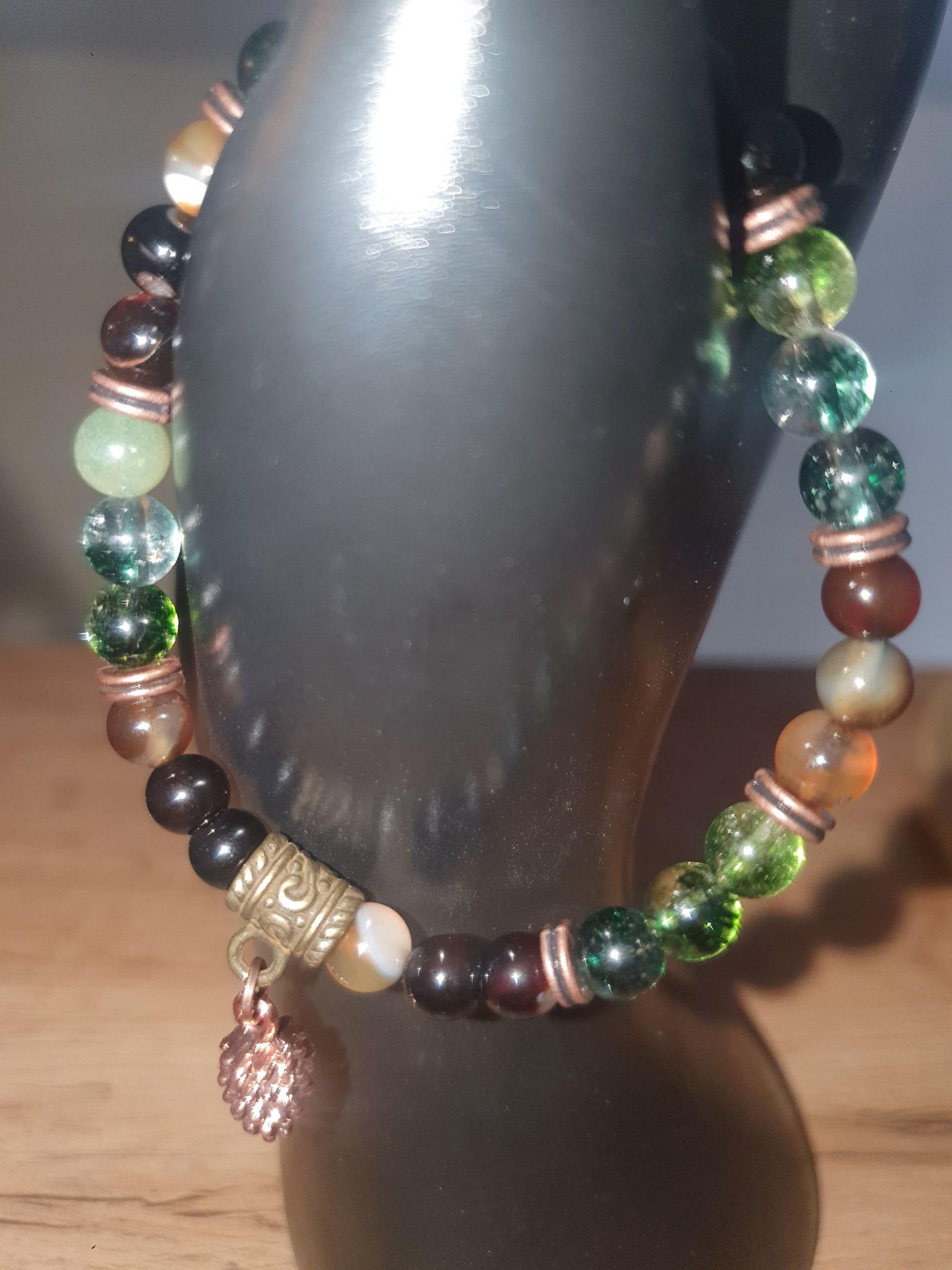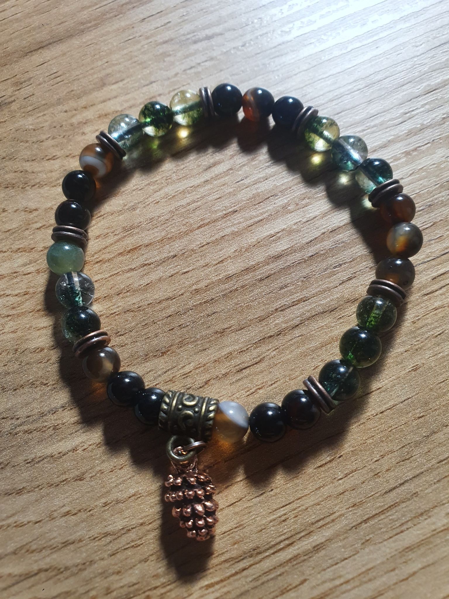 Bracelet Cœur de la Forêt en agathe mousse et agathe rayée brune. 6mm.