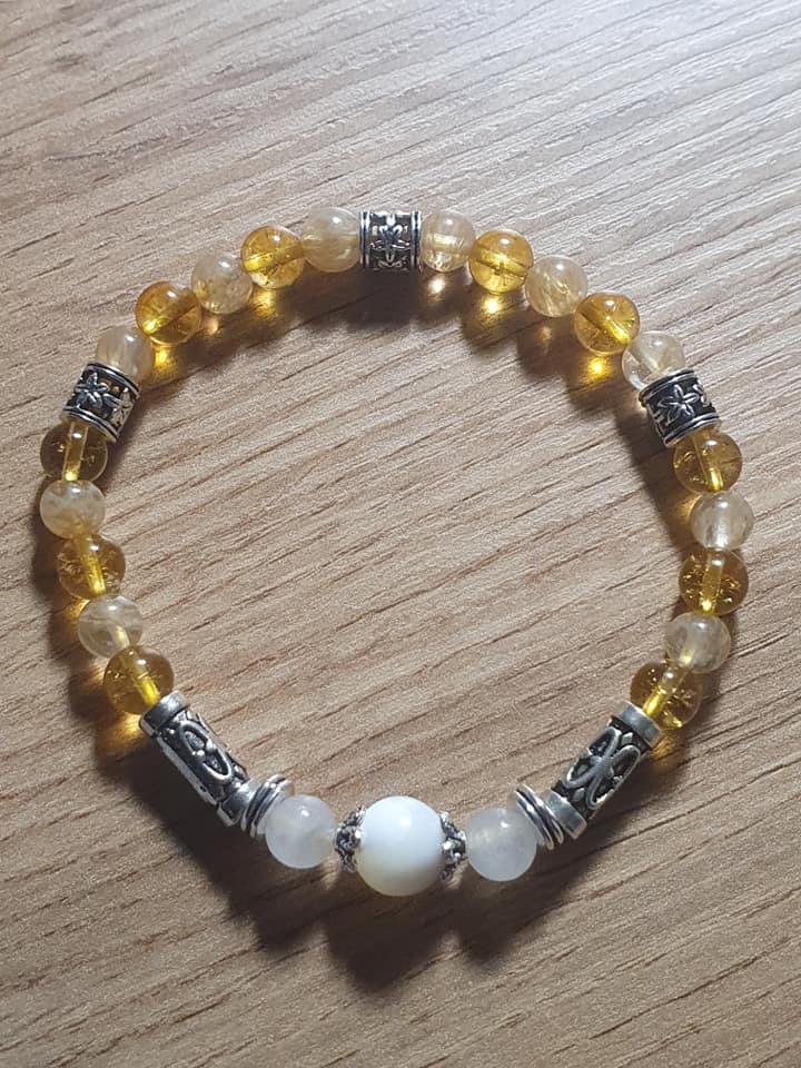 Bracelet Eveil des Tournesols en quartz watermelon et tea, moonstone et coquillage. 6 et 8mm.