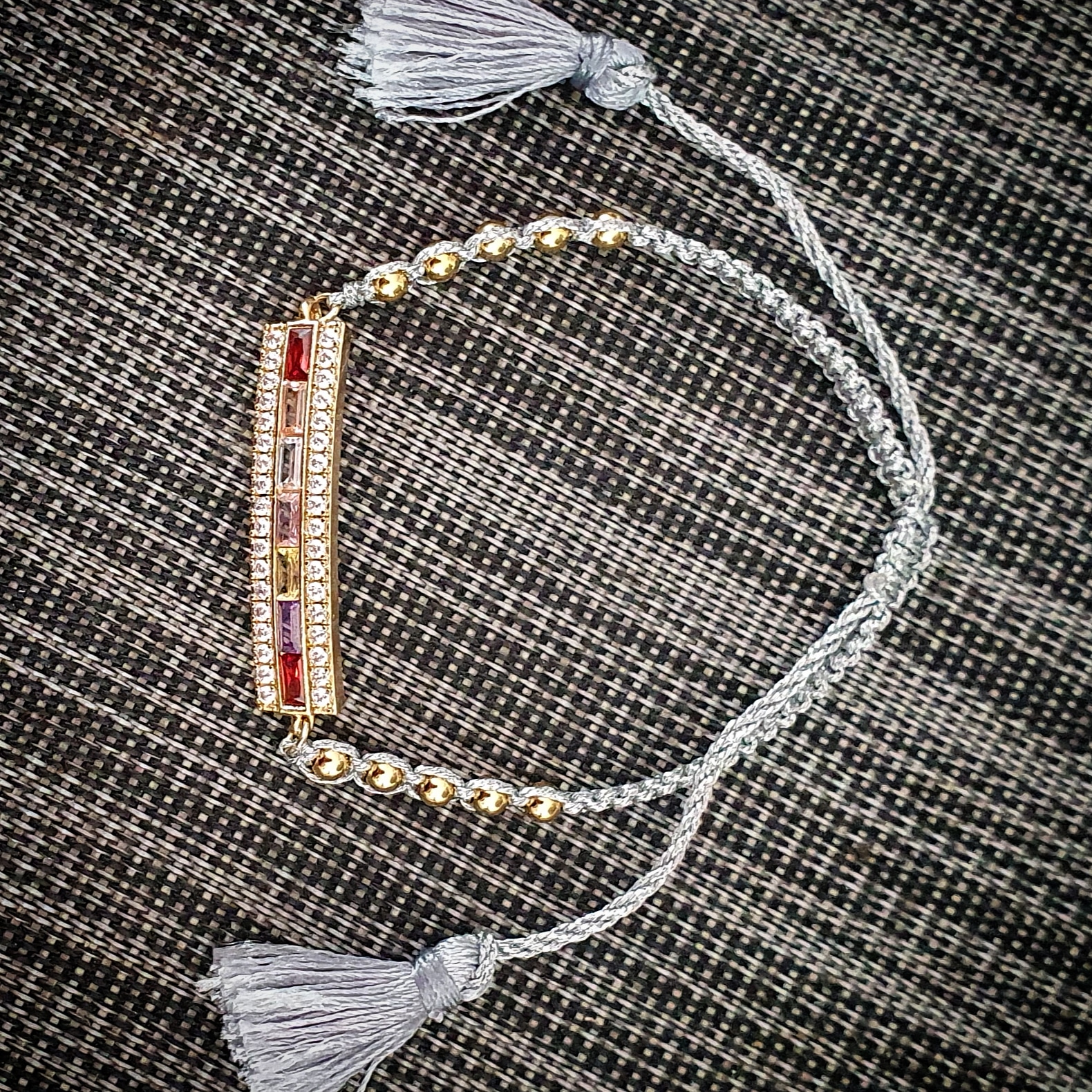 Fil tissé règlable argenté. Pompons.