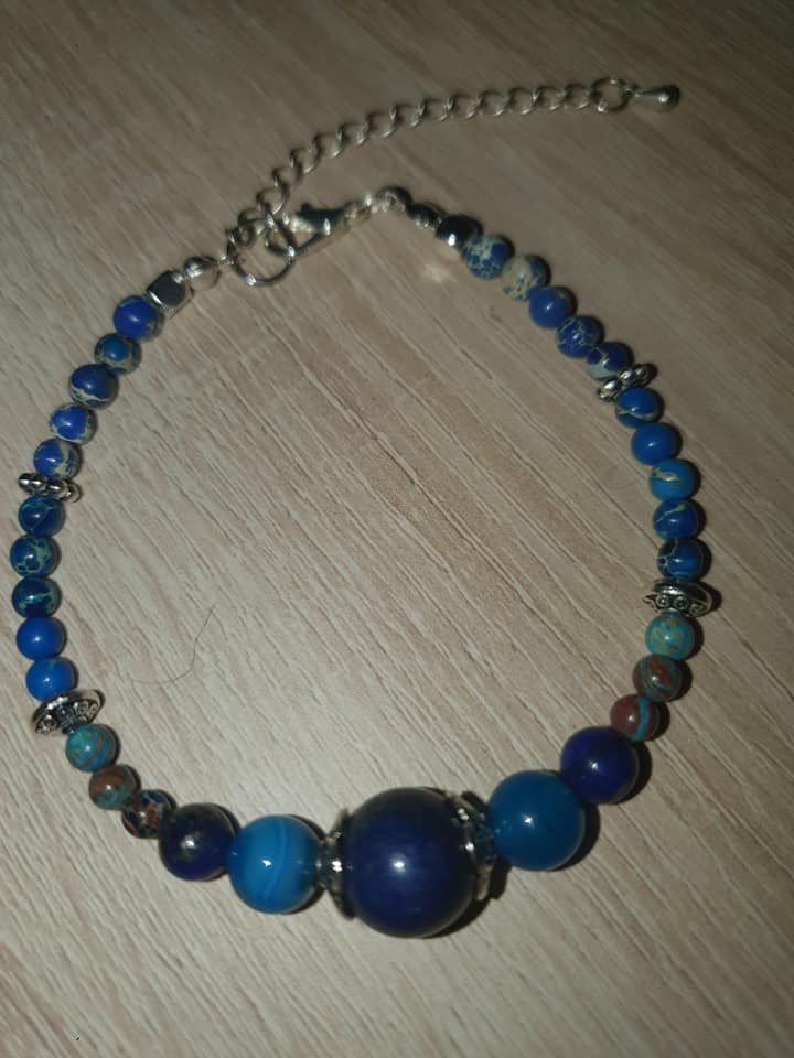 Bracelet Océan Calme en apatite, lapis lazuli, blue sea sediment. 4, 6, 8 et 10mm. Fil métalique ajustable.