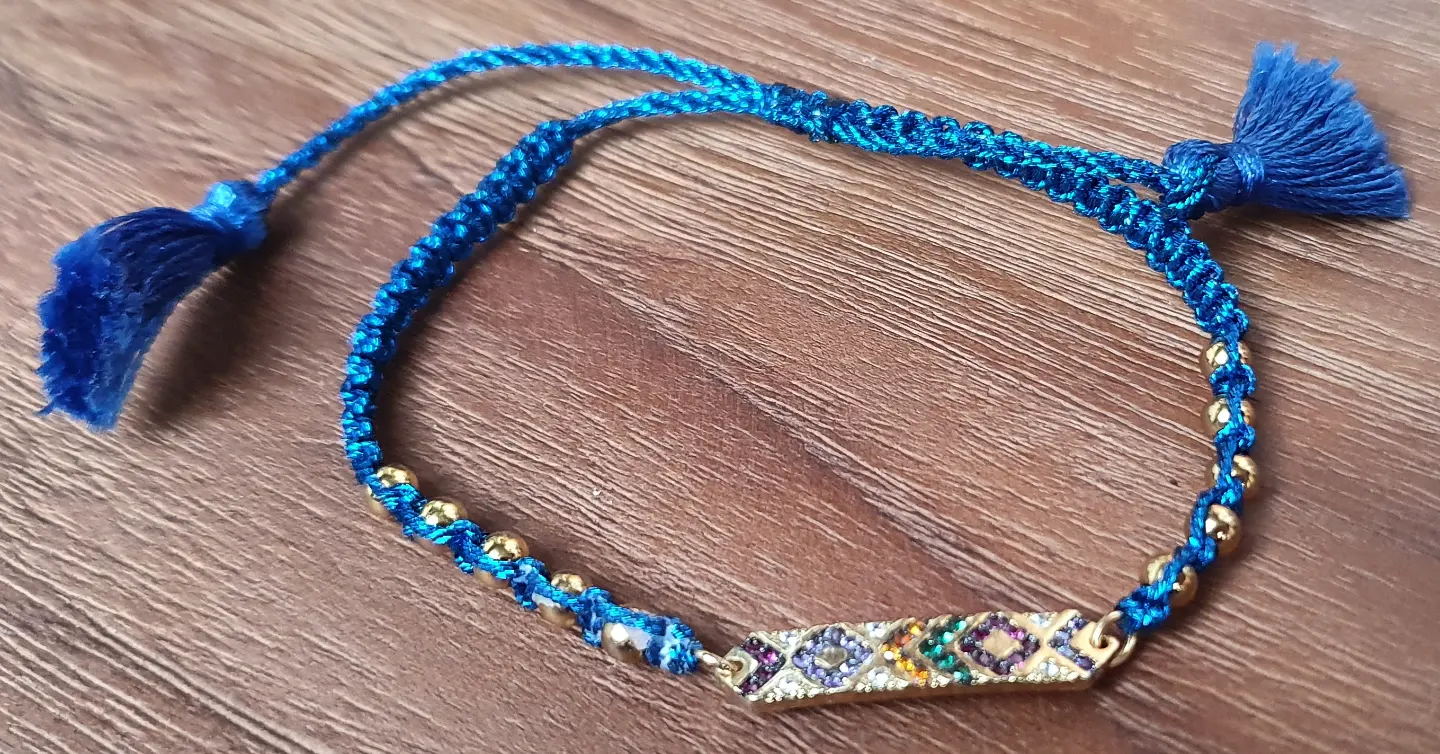 Fil tissé rouge réglable et perles dorées.