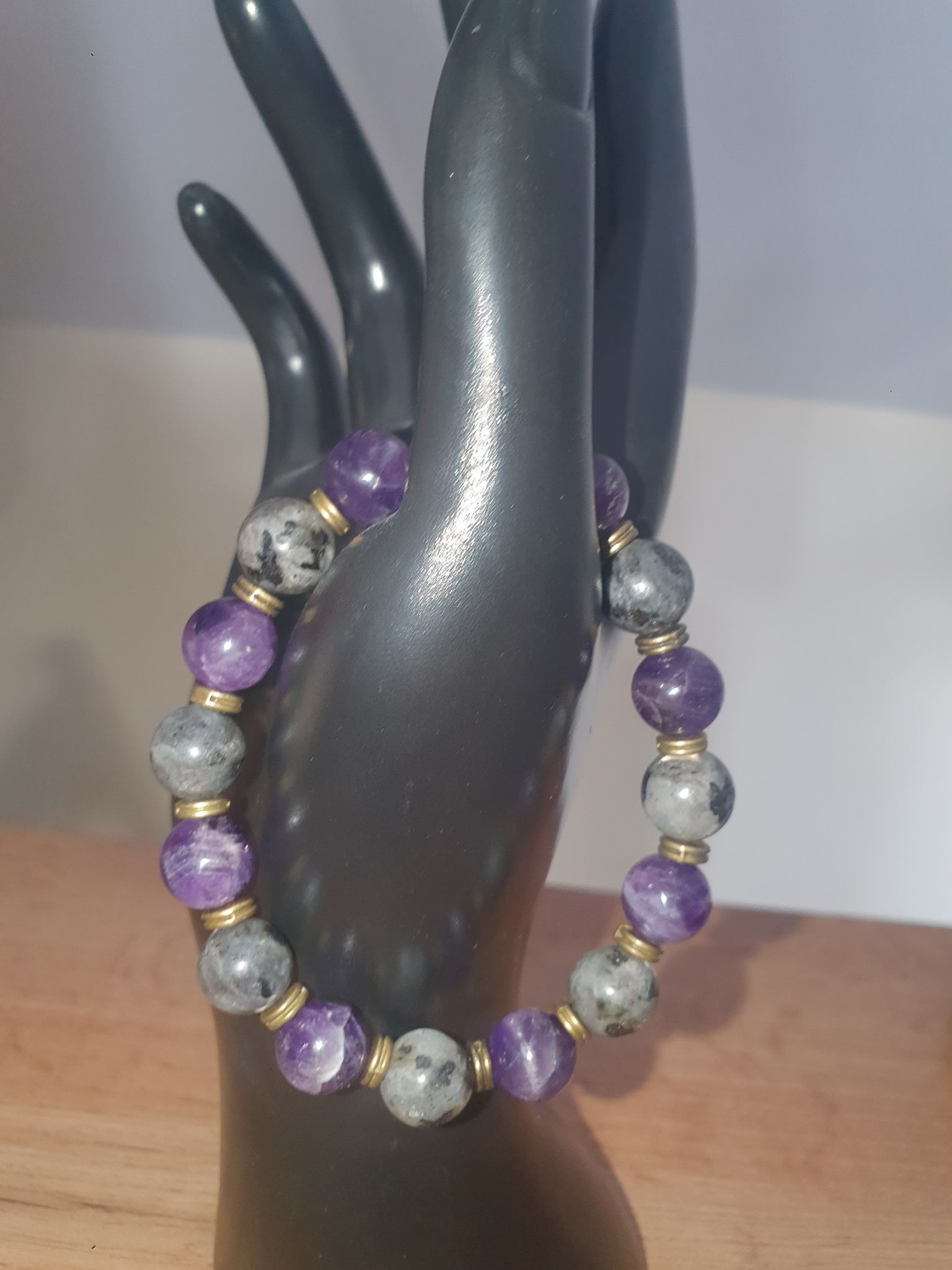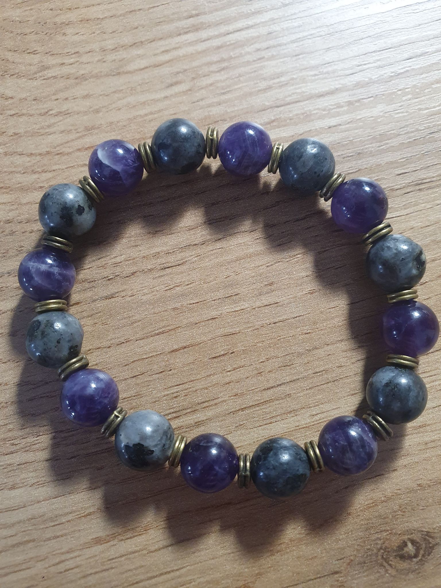Bracelet Souffle Ethérique en labradorite larvikite et améthyste. 10mm.