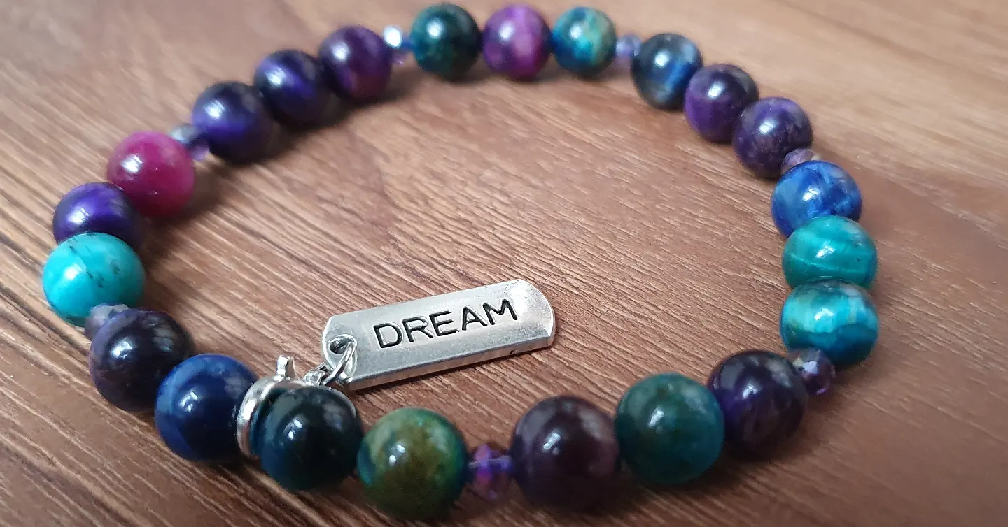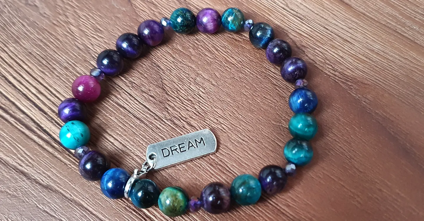 Oeil de tigre teintée. Tag métal argenté “Dream”.