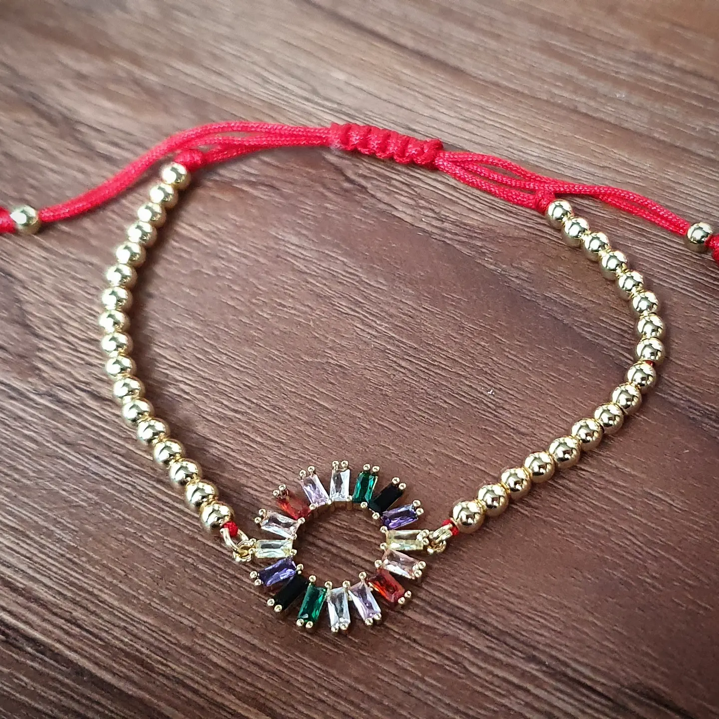 Fil tissé réglable rouge et perles métaliques dorées.