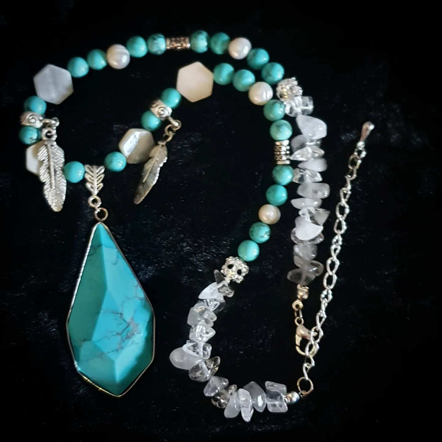 Turquoise naturelle et de synthèse, cristal de roche, nacre, perle d’eau douce irrégulière.