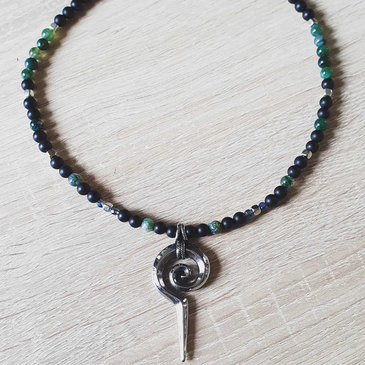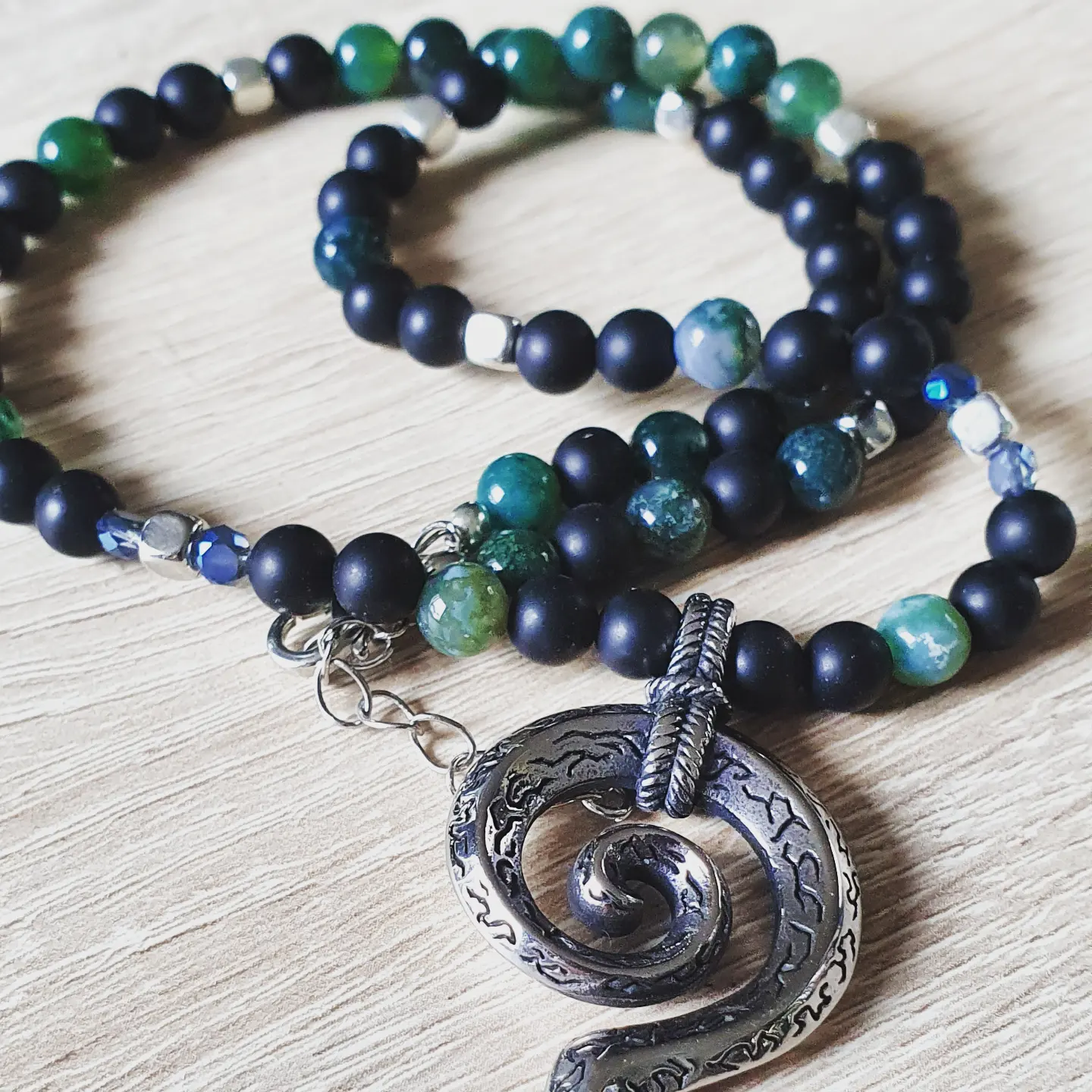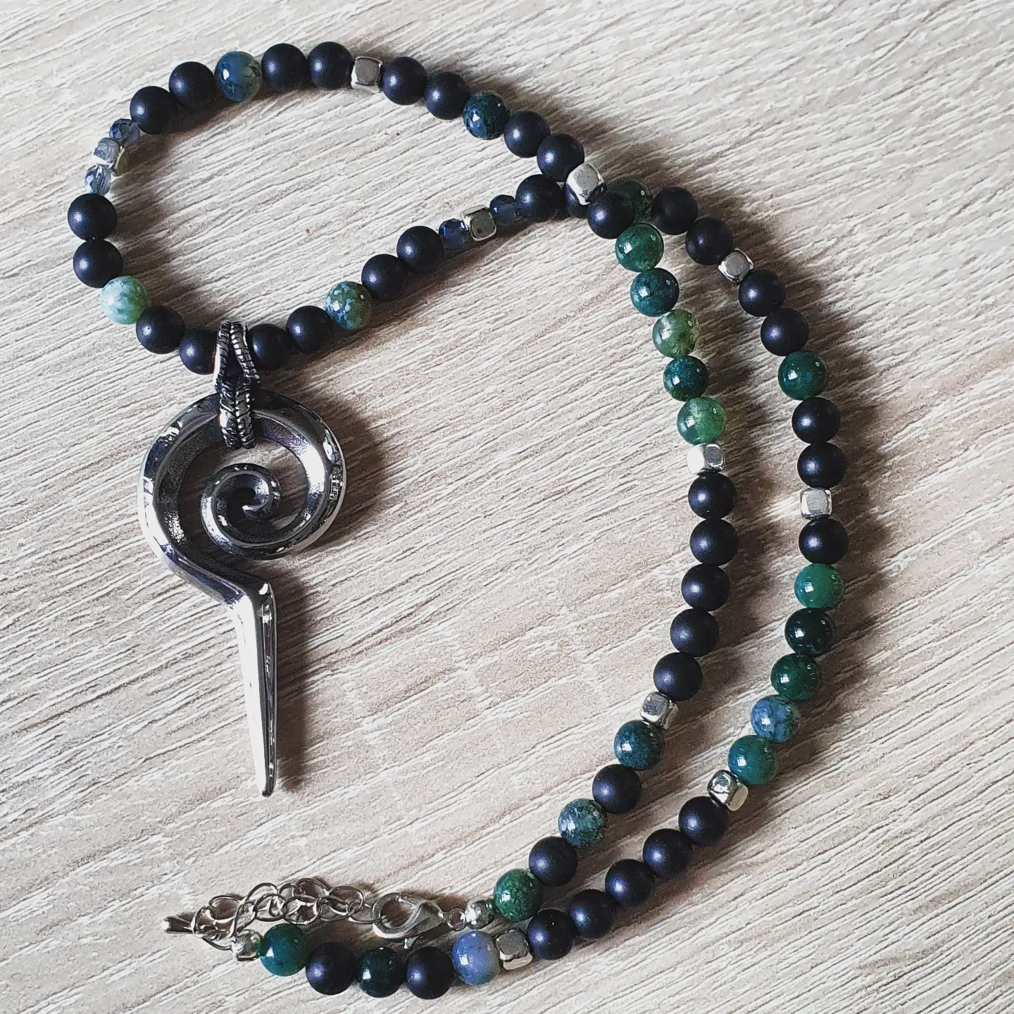 Cristaux, agate mousse et Agate noire matte.