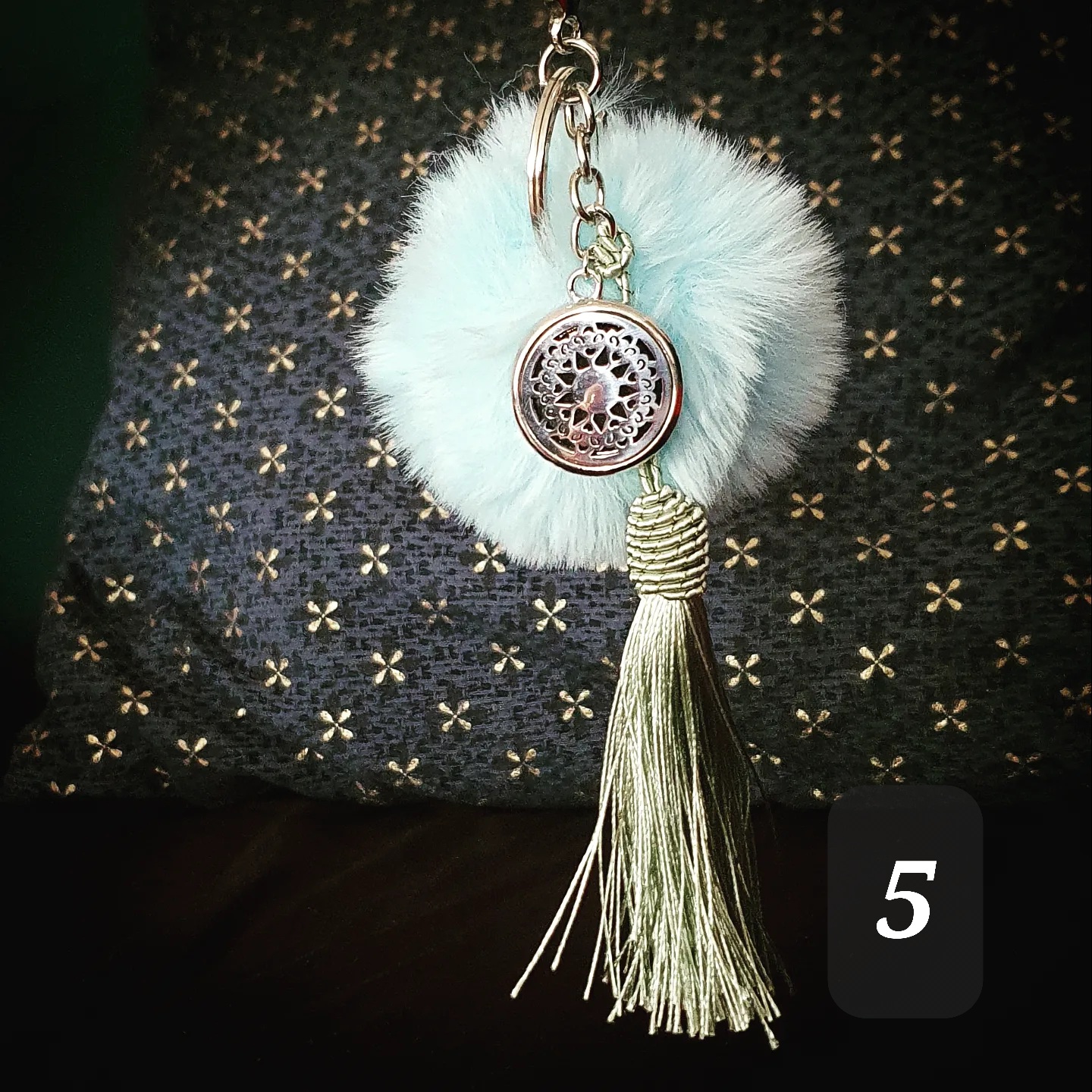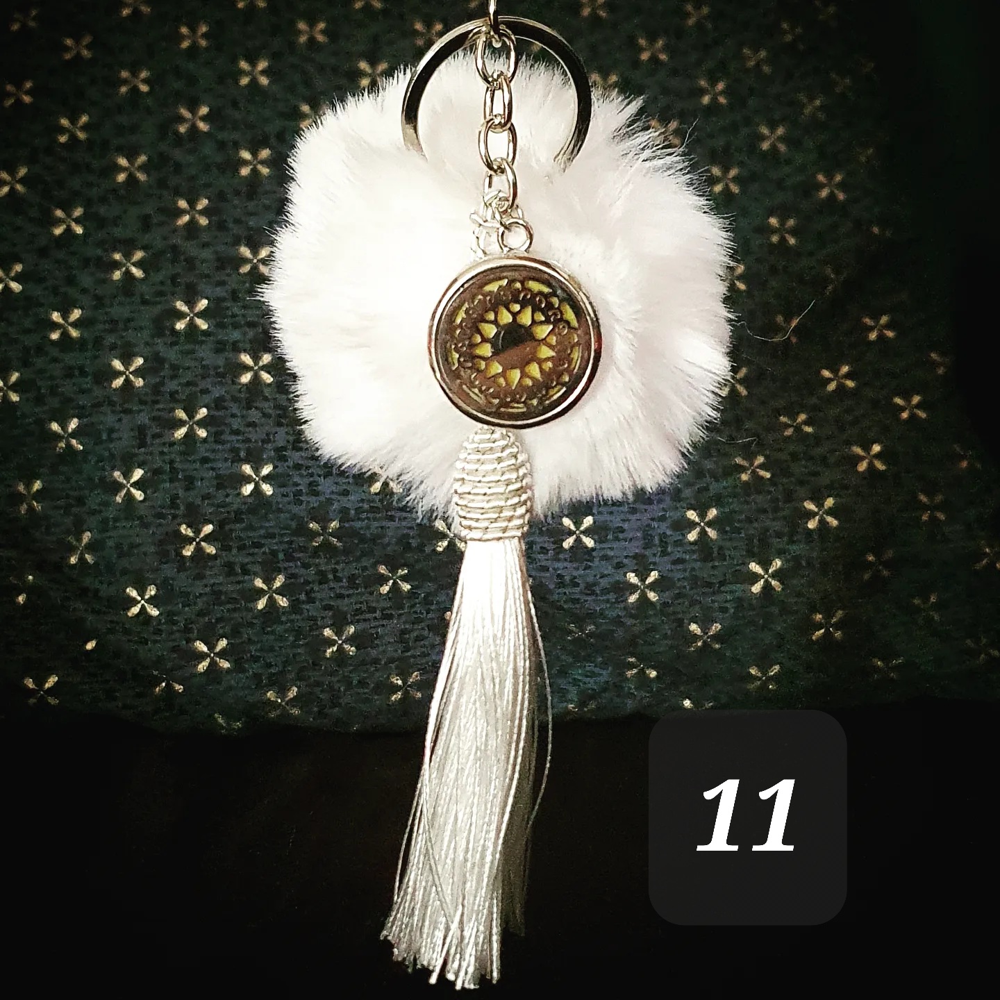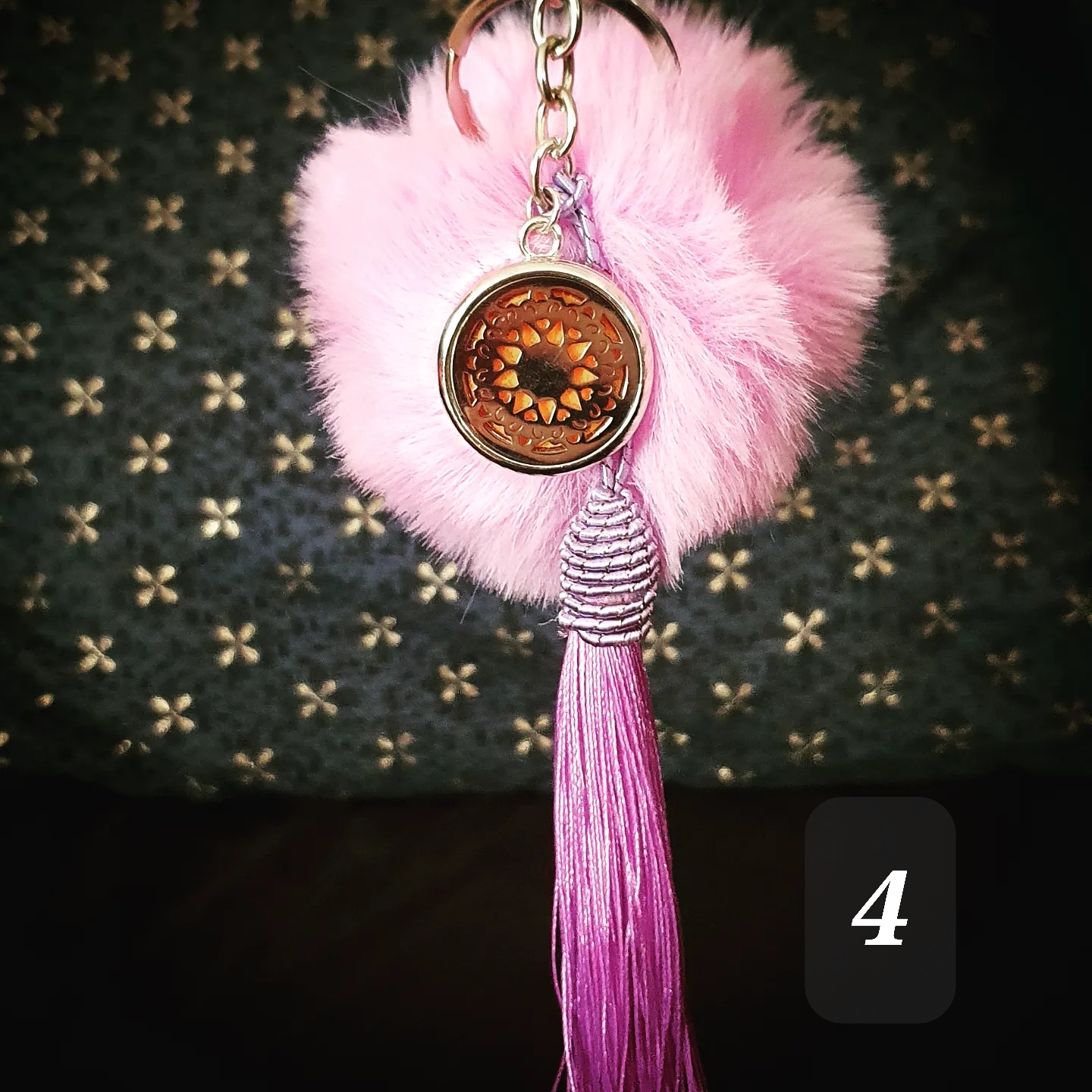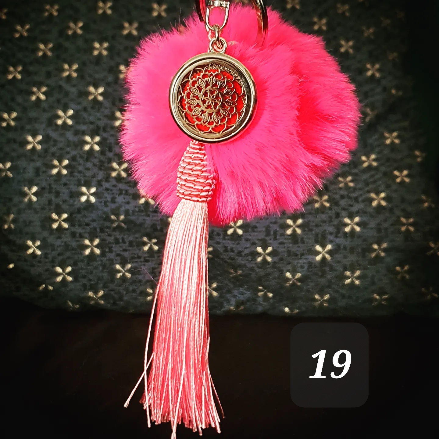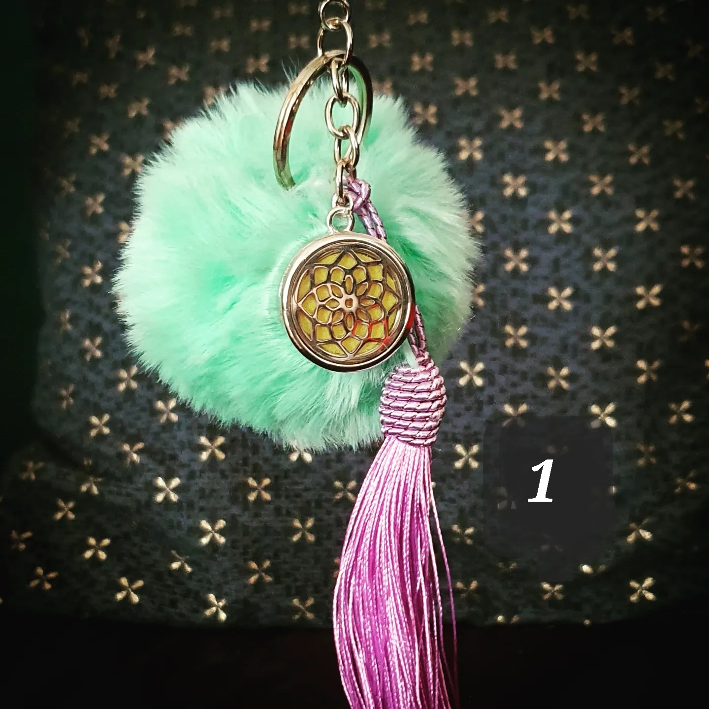 Porte clef coloré, pompon doux, pompon gland et médaillon métallique.