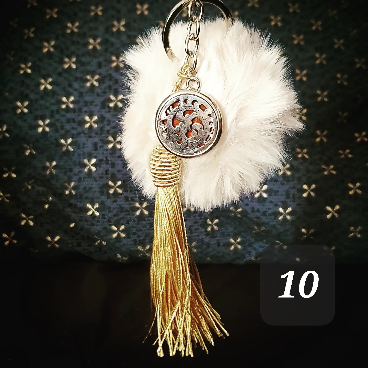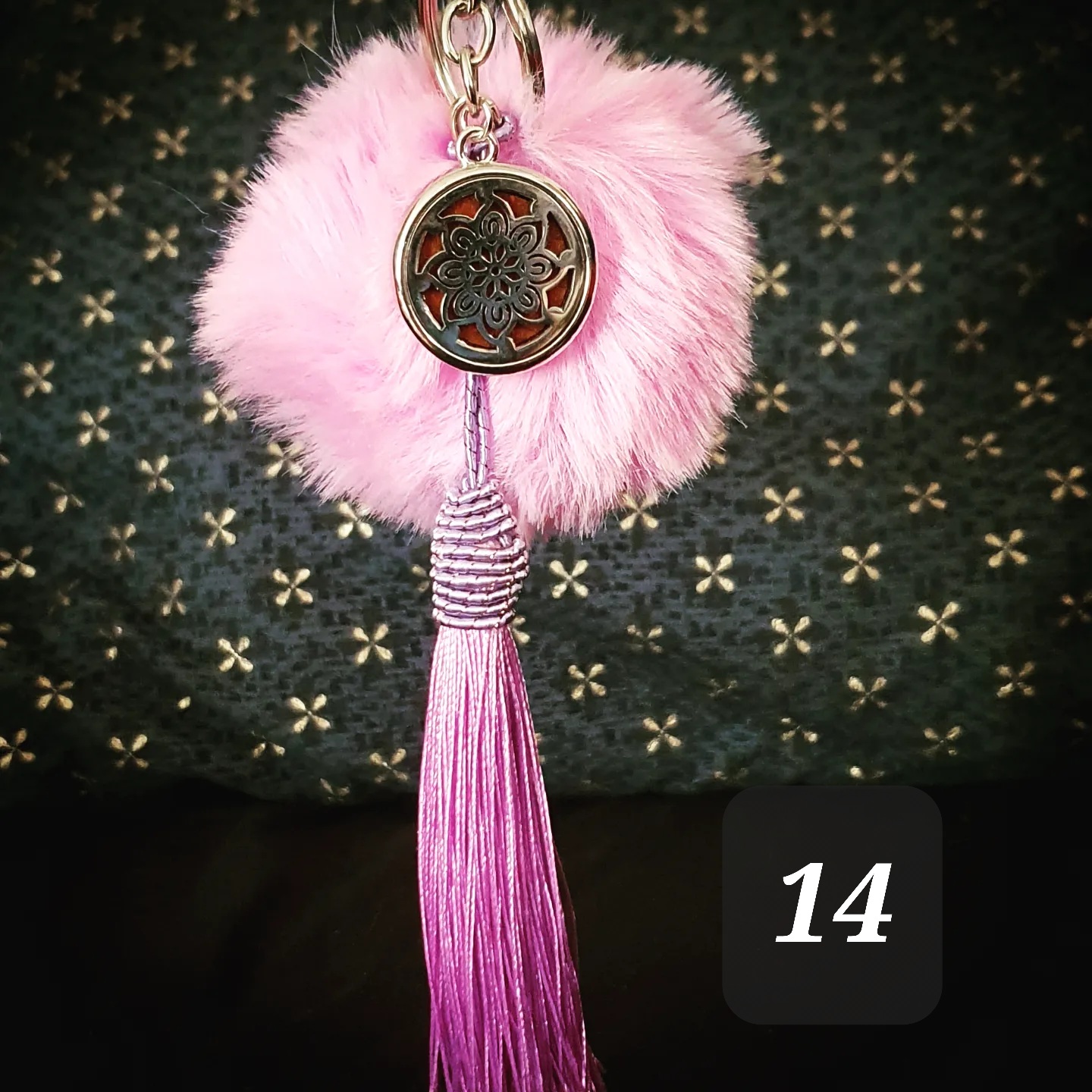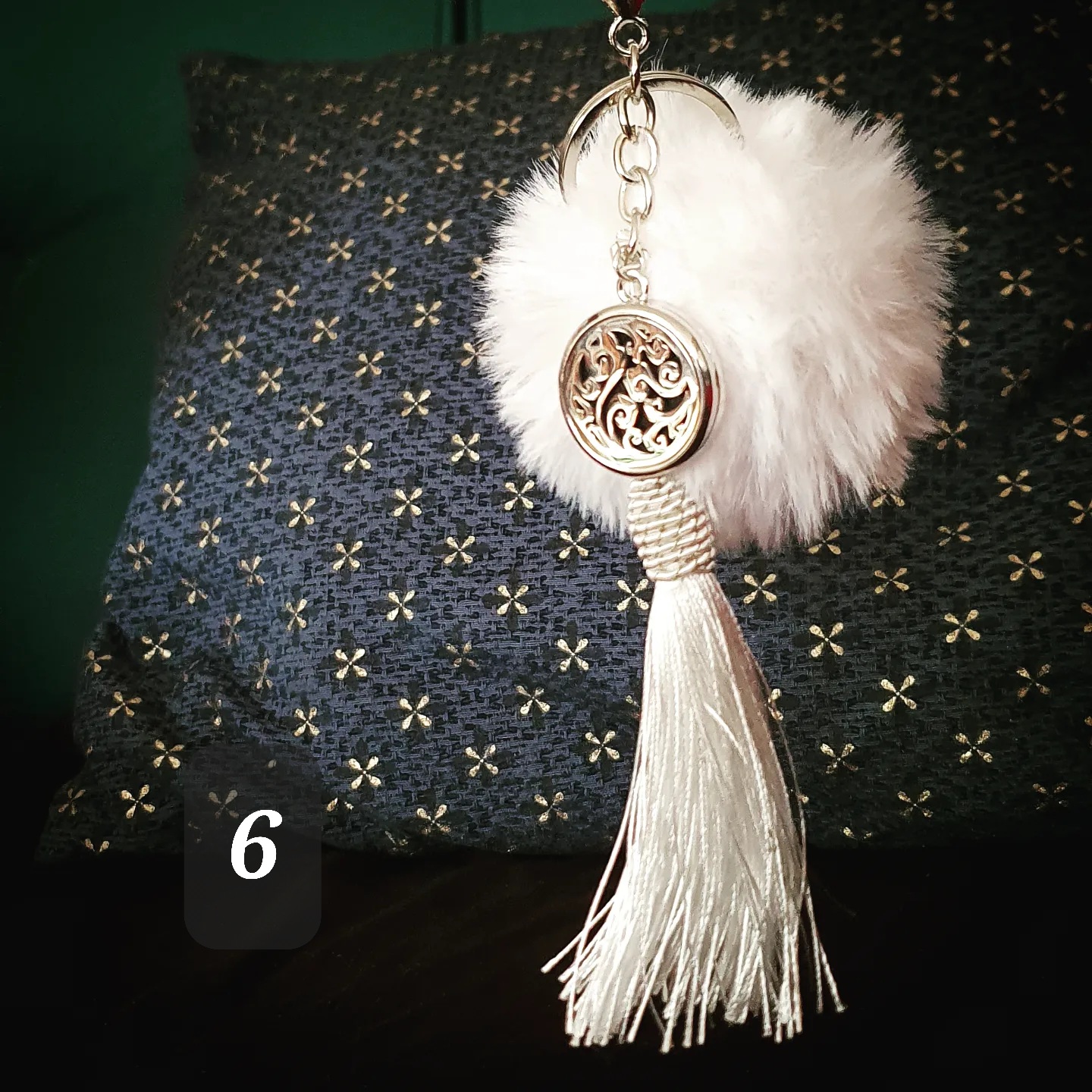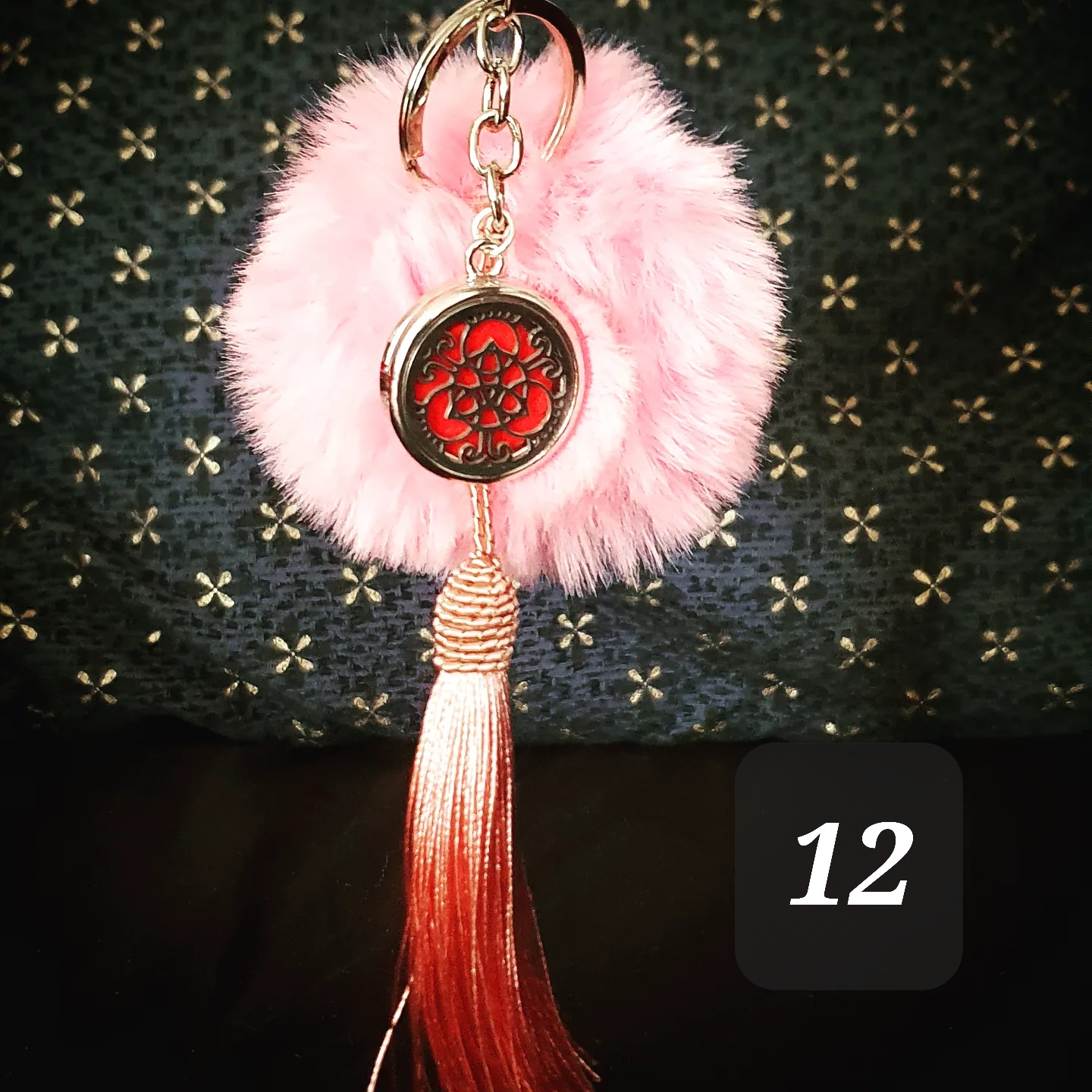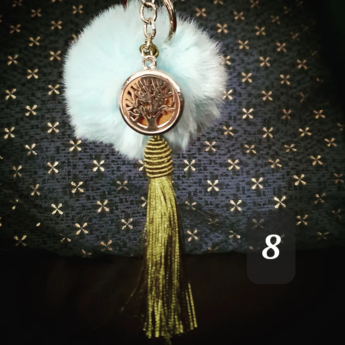 Porte clef coloré, pompon doux, pompon gland et médaillon métallique.
