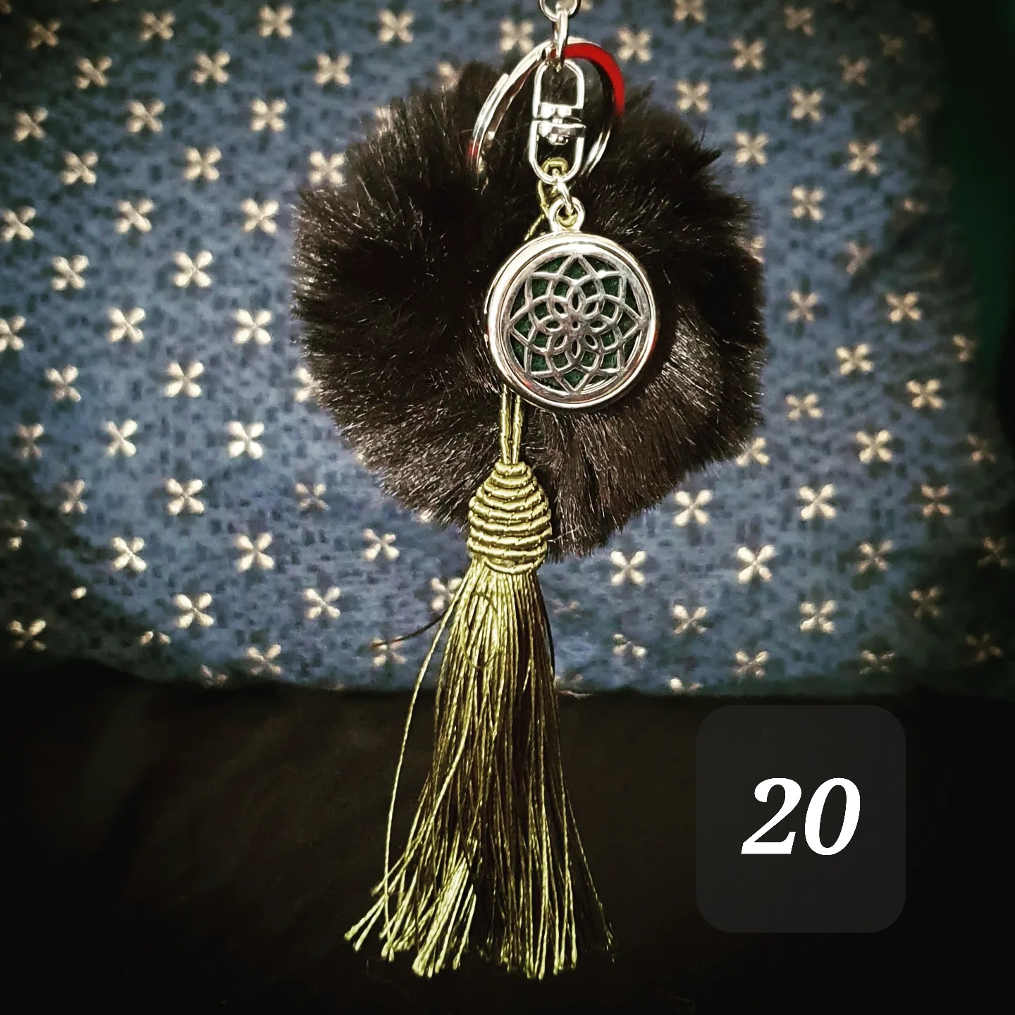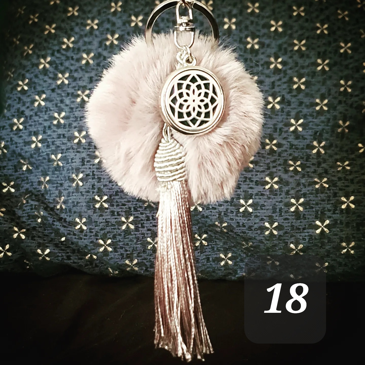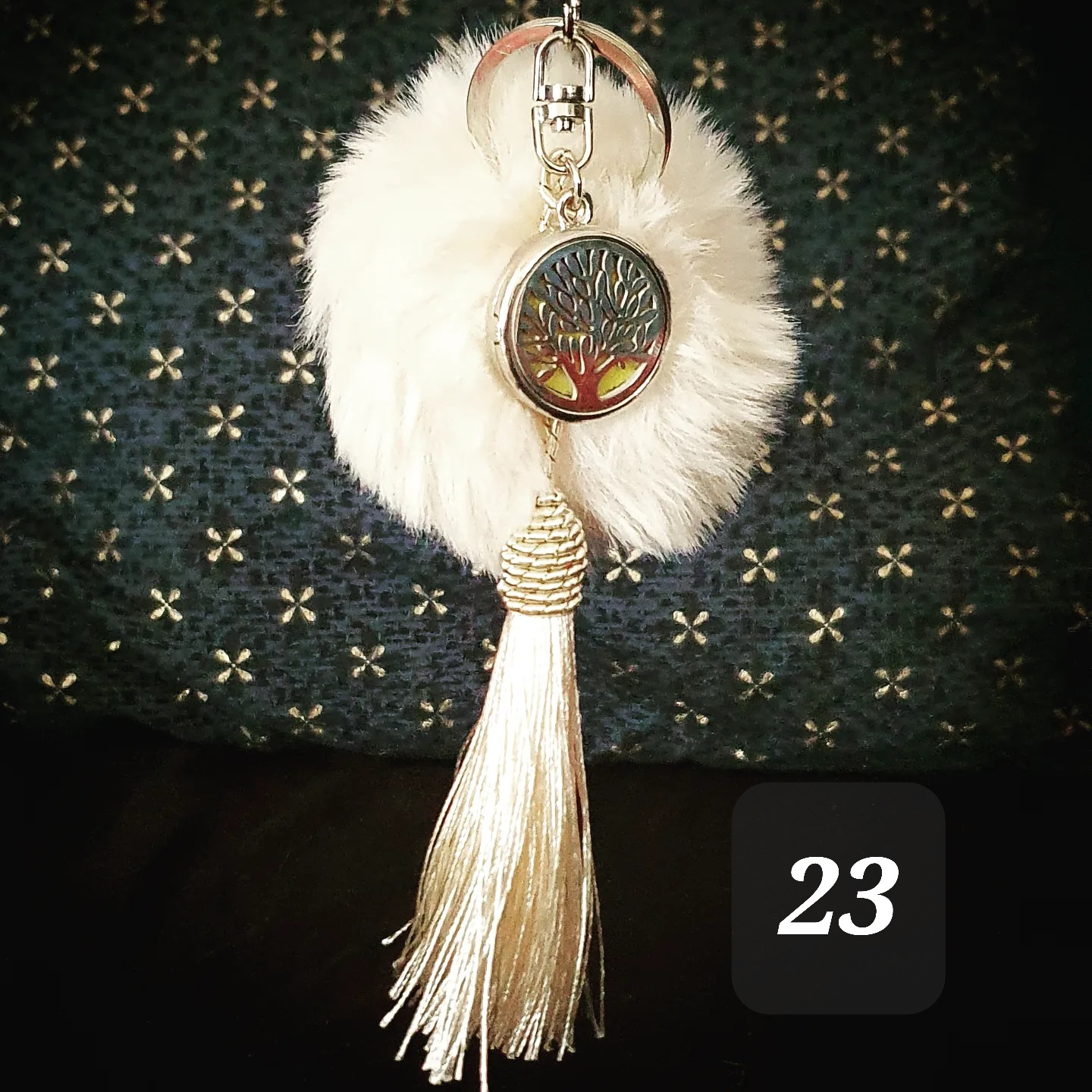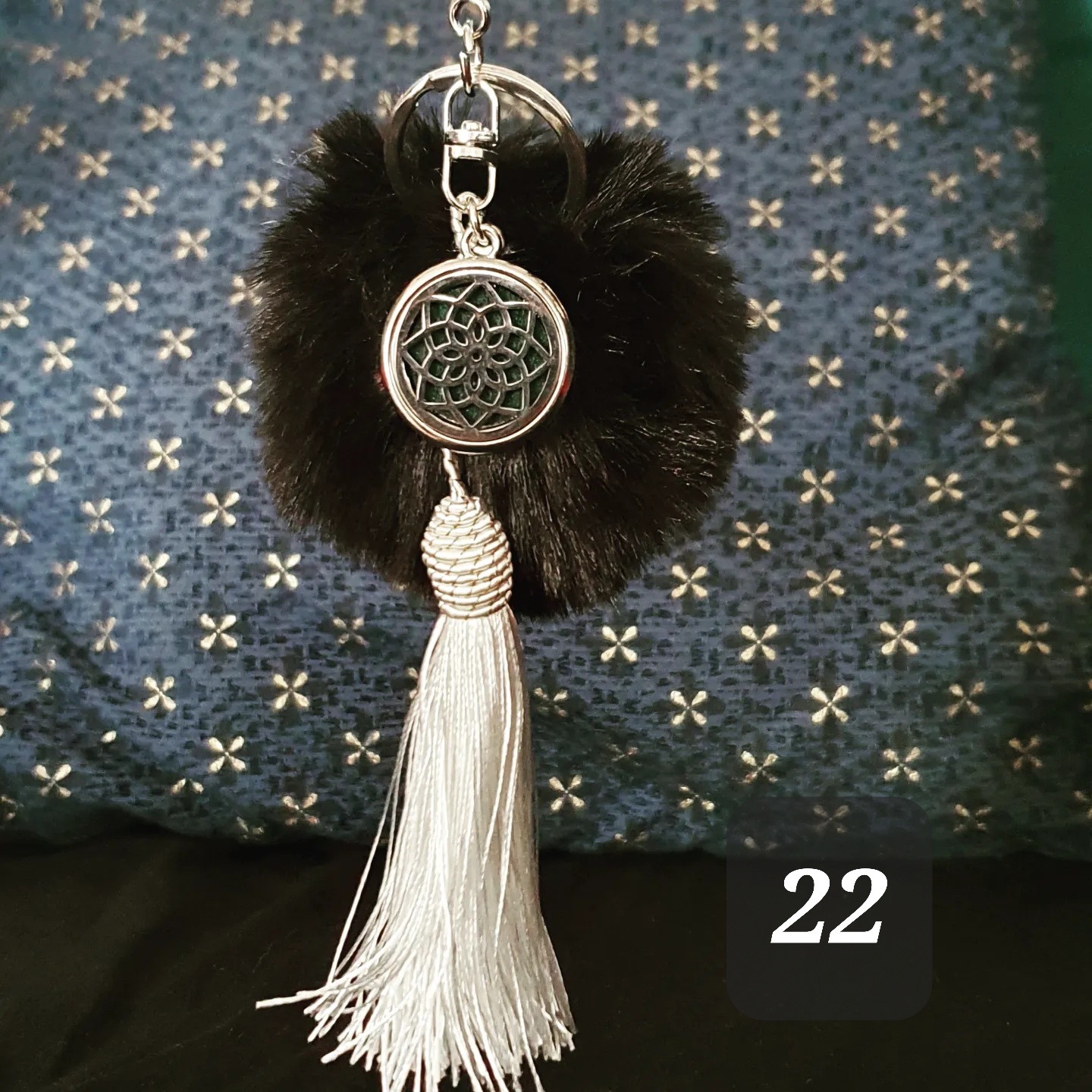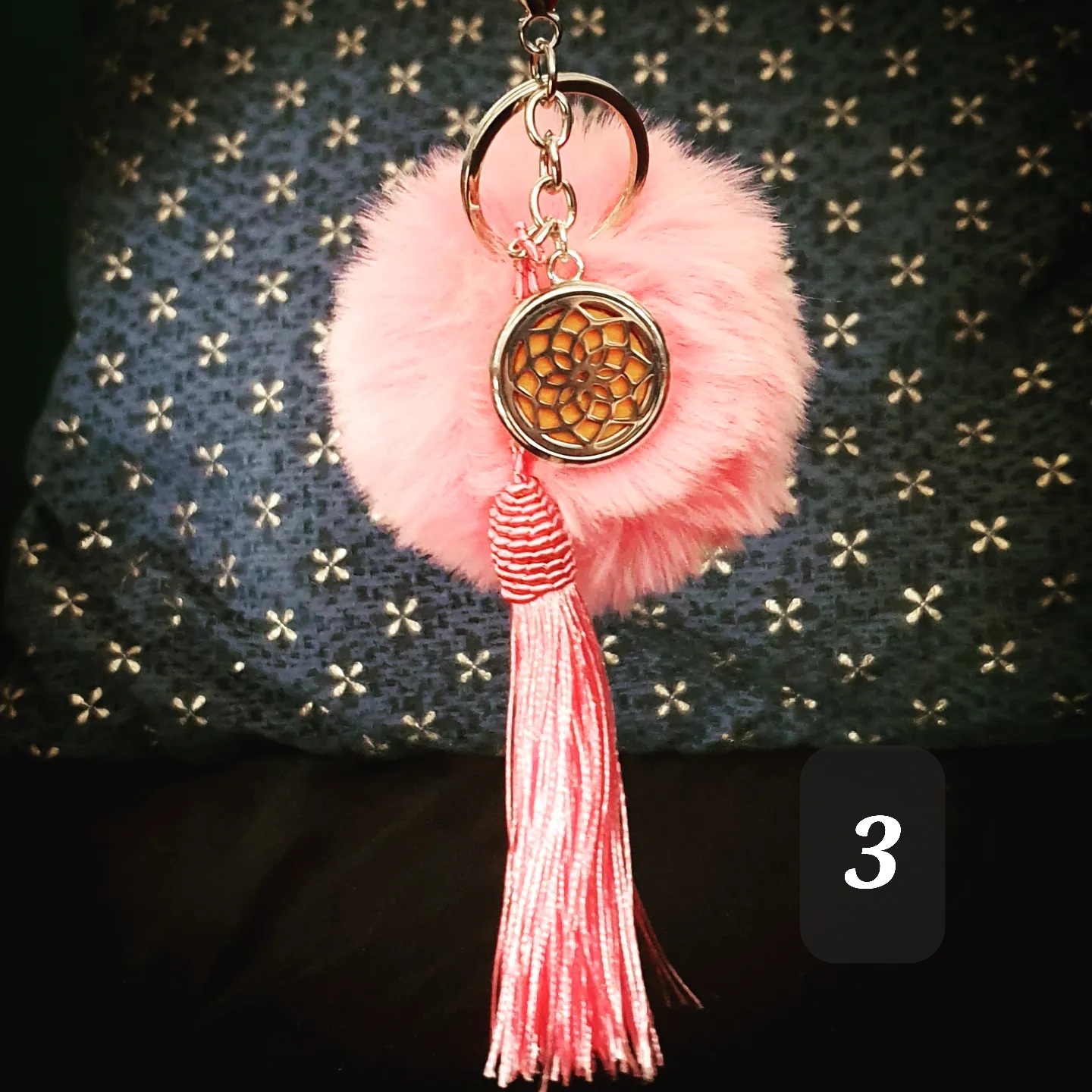 Porte clef coloré, pompon doux, pompon gland et médaillon métallique.